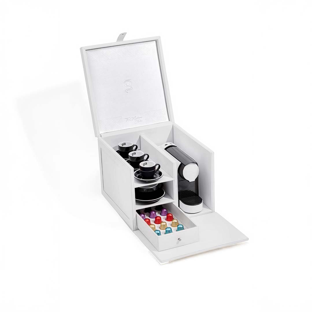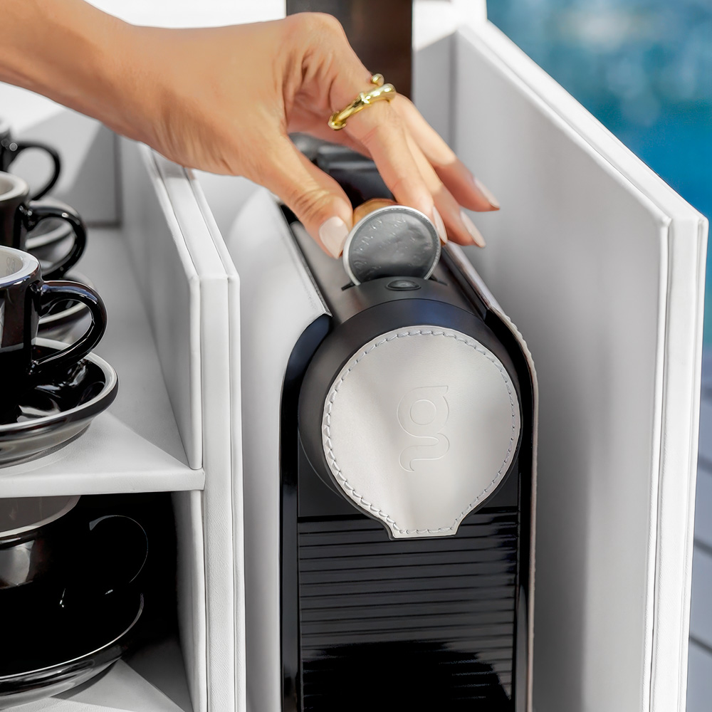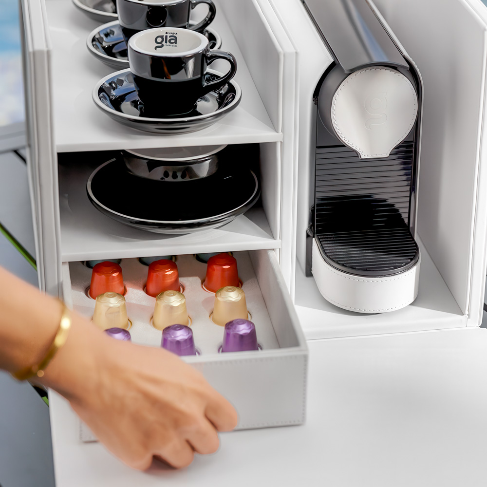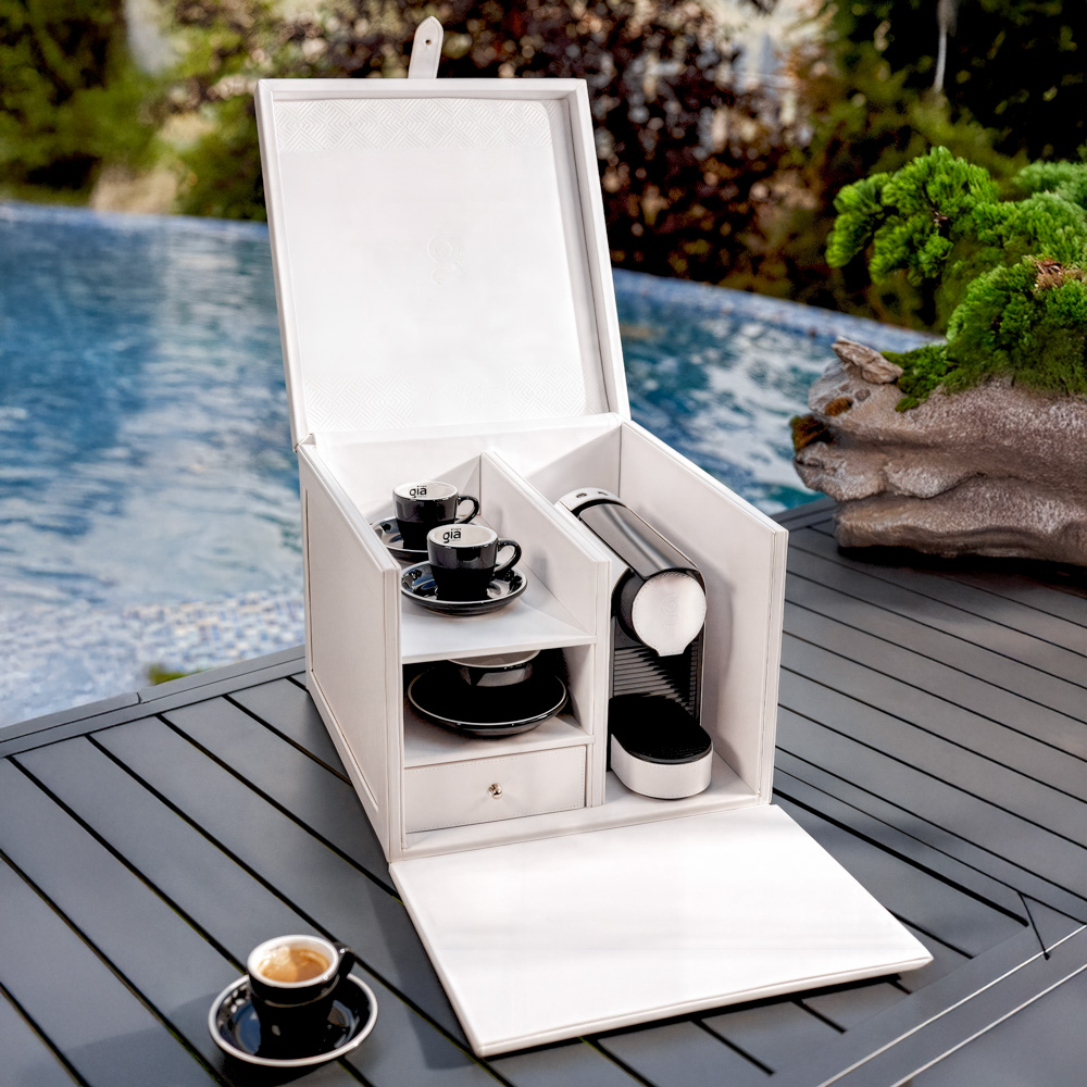 Experience unparalleled luxury with this exquisite item, meticulously crafted from premium Italian leather. Its sophisticated design features elegant stitching throughout, a hallmark of true artistry. The box is a masterpiece in itself, offering a custom-fitted cover for your Najjar Gia machine, fashioned from matching high-end Italian leather with complementary stitching. Thoughtfully designed, the box also includes dedicated compartments for your coffee cups and a convenient drawer to neatly store your Najjar Gia capsules.