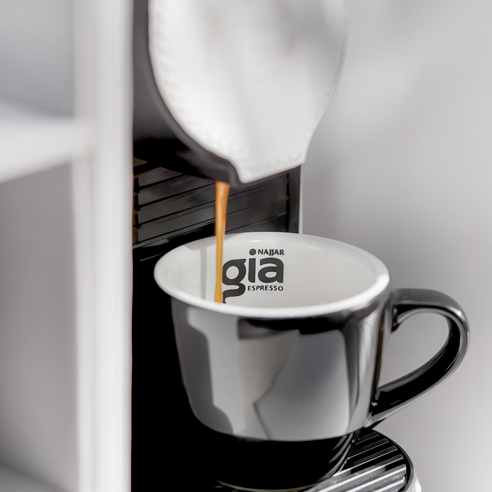Each box includes three gia single cups, two gia double cups, and five capsule sleeves featuring our signature blends: Milano, Lungo, Ristretto, Vivacio, and Decaff.